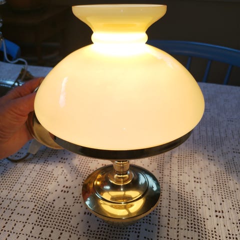 Lampa er helt iorden og gir et lunt og behagelig lys. Høyde ca 23cm. Og avstand fra vegg til lampa ca 7cm. Diameter bredeste del av lampa er ca 12,5cm.