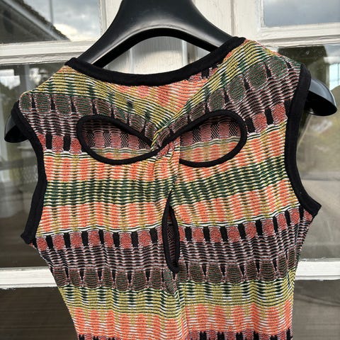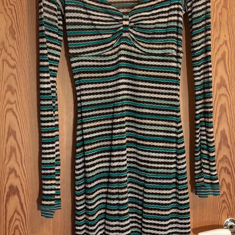 Enkelt og elegant kjole fra MISSONI X LINDEX sin collab. Den ser nesten ubrukt ut, og den er ingen sjenerende hull eller rifter. Litt 70-talls preg over snittet, knapp i nakken for festing. stilig med boots og sandaler. Størrelse er ca 38.