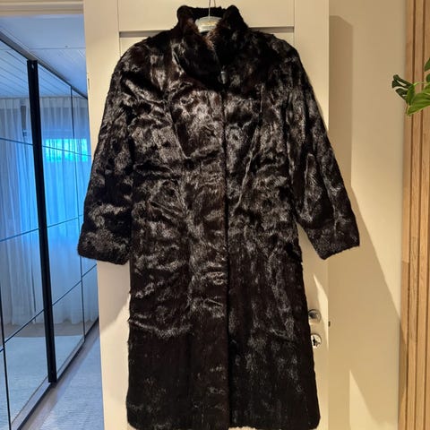 Følger med en liten hatt og et skinnbelte. Merk at den ene hemnen til beltet har røket