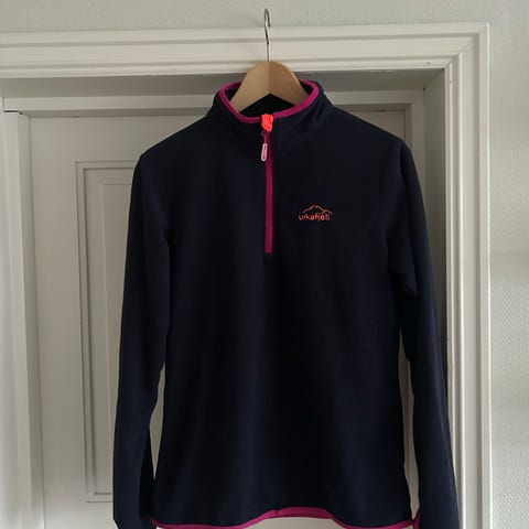 Vikafjell genser med zip. 50% ull og 50% akryl. Blå og hvit med orange detaljer. Lengde fra hals ca 65cm.