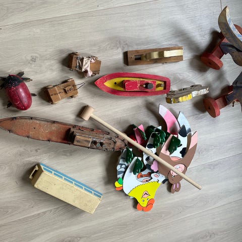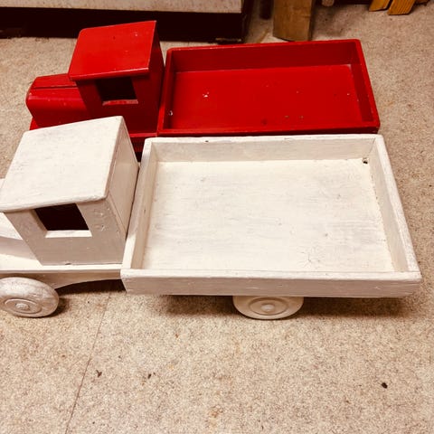 Lastebil i lakkert tre, laget på Strømsø i Drammen i 1954. L: 40,5 cm, b: 14,5 cm, h: 14 cm. Forakselen kan svinges. Lett bruksslitasje, men ellers i veldig god stand. Kr 350.