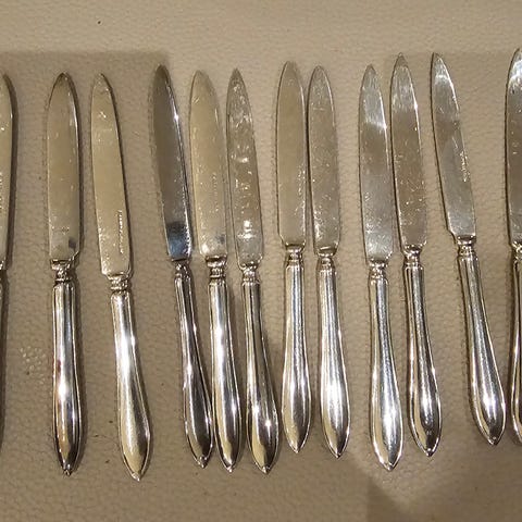 Lot med åtte smørkniver i sølvplett( antar det er det da jeg ikke finner noe stempel) med flott pyntedekor.