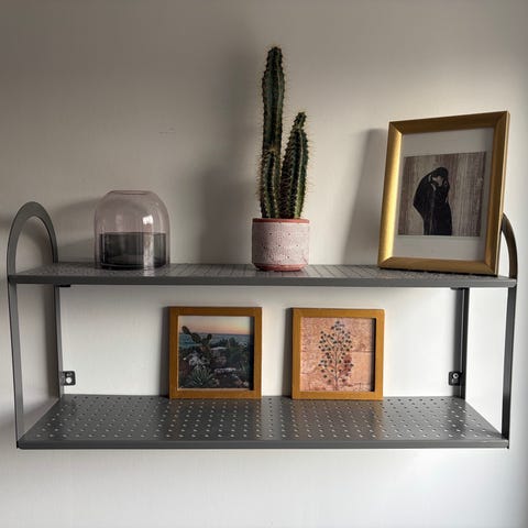 Stilfull og moderne vegghylle i metall. Elementene kan beveges/settes sammen etter eget ønske.