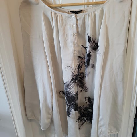 Langermet bluse i str. 18/ 46 selges til fastpris kr. 75. Blusen er kjøpt i England og er av merket New Look. Blusen er hvit, og har broderier på skuldrene. Pent og lite brukt, ingen hull eller flekker.