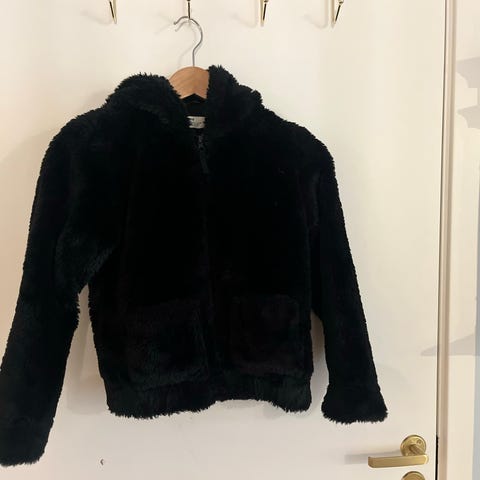 Pelsjakke med hette som har ører. Tykk, myk og deilig jakke som kun er brukt få ganger.