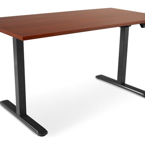 DNA skrivebord på sorte I-bein, med manuell innstilling av arbeidshøyde (650 - 800 mm). Skrivebordene har 25 mm laminat bordplater for god stabilitet.