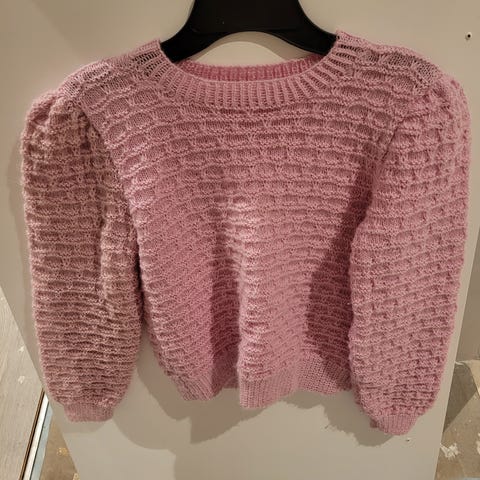 Hjemmestrikket rosa Tirilgenser til barn. Litt usikker på størrelse, men ble brukt her fra 2-3 år.