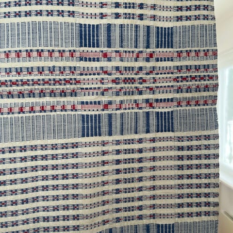 Et stort stykke ubrukt tekstil fra Sandvika Veveri, design Troja. Jeg vil tro dette er fra slutten av 1980-tallet eller 1990-tallet. Det har en litt falmet brettekant på midten, ellers god stand. Litt dypere i fargene enn på noen av bildene. Ca 130x160 cm.