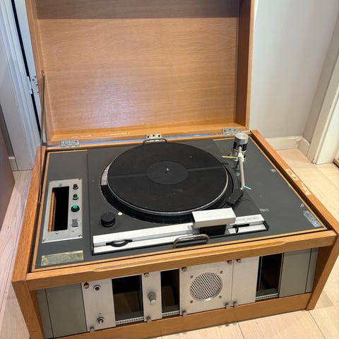 NRK maskin, standard utgave med T.S. mod, ekstra felt m. fader og høyt., (dette panelet er fjernet og erstattet med blankt, slett panel). Bred krybbe med hjul. Spiller er justert og restaurert på tidligere tidspunkt - alt er ok. Maskin er en "playback- only" spiller uten opptakskort.