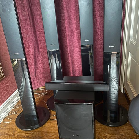Komplett anlegg med sub. 5 satelitthøyttalere fjernkontroll og bruksanvisning. Dvd skuffen er litt treg og må hjelpes litt inn og ut. Ellers fin stand og nesten ikke brukt.