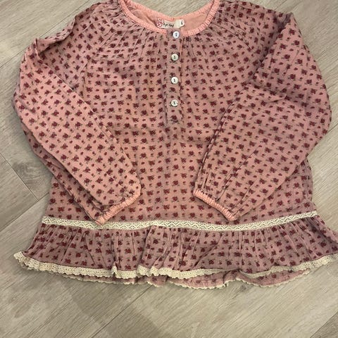Søt bluse i rosarød farge med blå og hvite blomster selges. Pent og lite brukt. 100 prosent bomull.