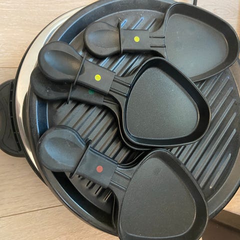 Princess Raclette Oval Grill med oval form og flere små panner under grillflaten. Passer til tilberedning av kjøtt, grønnsaker og smeltet ost. Designet for bordbruk og sosial matlaging.