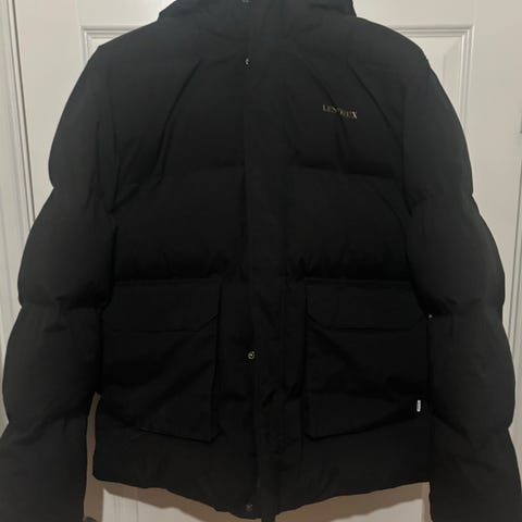 veldig tjukk jakke, holder deg varm 100 prosent. dunn jakke så den tåler ikke vann. tåler litt vann som snø, men regn funker ikke så fint. ganske ny. ikke mye brukt, limited edition.