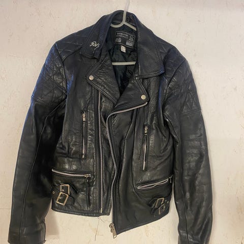 Sort patchwork skinnjakke. Lengde bak 70 cm.
