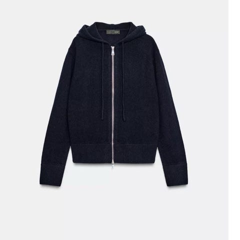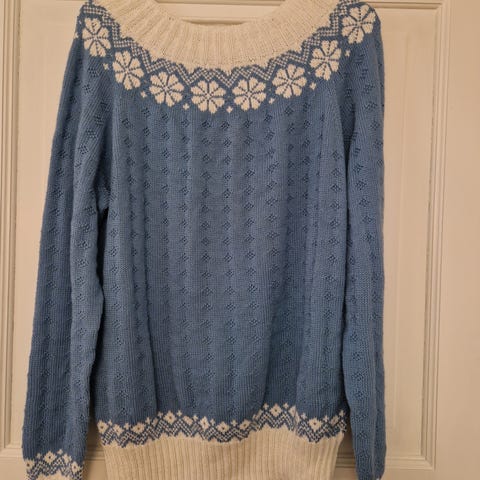 Feminin genser i kort modell med v utringing og hette. Genseren har høye ribbestrikkede vrangborder, snøring i livet og ledig passform.