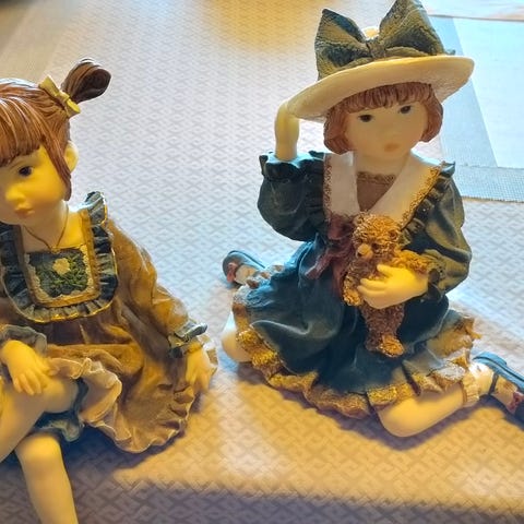 Tre små porselensfigurar, to hollandske figurar med børtre og tre små bøtter, ein liten hund. Porselensjenta er limt, men så pent reparert at det er vanskeleg å oppdage. Jenta og guten er 9 cm høge, hunden 4 cm høg. Kr 105 + ev. porto. Eg bruker ikkje betalings-/ sendingsløysinga Fiks ferdig.