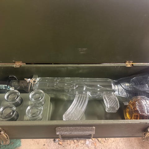 Selger min vintage pistol glassflaske med skrukork i "reell" størrelse med et flott serveringsbrett med 4 show glass. Pistolen kan brukes som drikke/serverings "flaske" med det innholdet du ønsker.