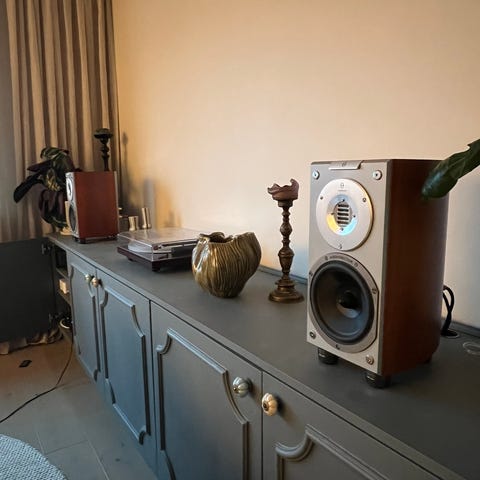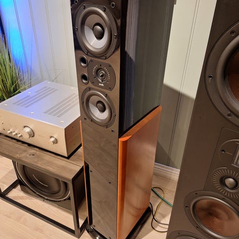 Andre paret jeg har av disse. Veldig bra lyd i forhold til pris. Krever ikke all verden av forsterkeren heller. De ser pene ut, men noe bruksslitasje finnes. Blant annet noen bulker i støvhetter som vist på bildene, samt hull nederst på frontdekslene. Må hentes!