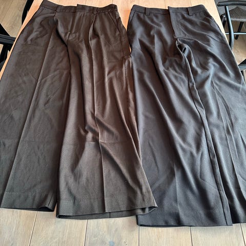 Disser buksene er har ett fløyelslignede utseende og fargen er helt nydelig. Buksen har skjult knapp i livet og hemper for belte.