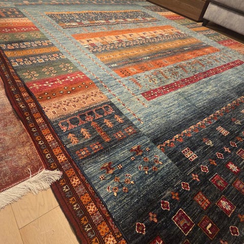 Luksuriøst teppe i Newsealand ull produsert i Belgia, nydelig kvalitet med super trådtetthet, loer ikke. Teppet er brukt, ingen flekker, merker eller «stier». Mrk: den mørkeste fargen er mørk blå (ikke svart) Se beskrivelse bak på teppet. Selges kr 3200