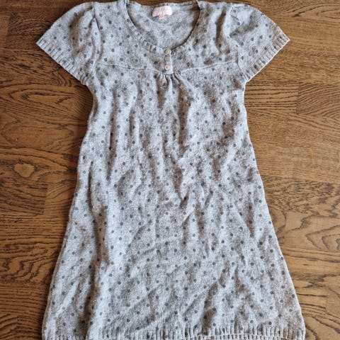 Søt kjole i nydelig blå farge selges. Merket er Claire kids, og størrelsen er 150, som tilsvarer 12 år. Kjolen er produsert i 50 % ull og 50 % acryl, myk og behagelig kvalitet. Kjolen er enkel, men med litt stjerner og paljetter på forsiden.