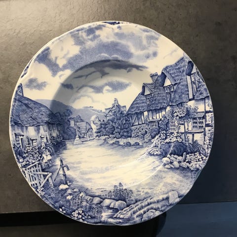 Vi har fått inn for salg et sett me fine porselen asjetter, 4 stk. Alle er hele og ingen skader. Selges komplett! Se bildene.