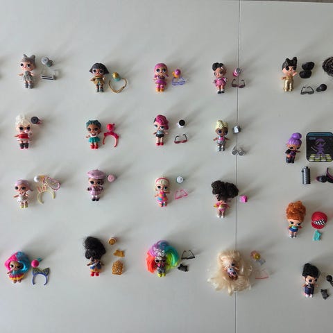 Her er det bukser, gensere, undertøy, shorts, lue, solhatt, briller, caps, sekk, kjoler, smoking, og telt. Blå kjole solgt.