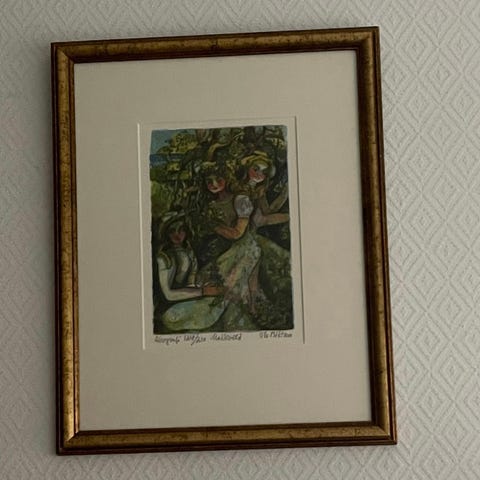 Ca 70x60 cm rammet inn bilde av Borghild Rud. Litografi nr 11/200 fra 1975. En frøken på sengekanten. Kan vurdere bud.