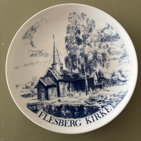Karasjok Gamle Kirke - platte. Blått/hvitt motiv. Baksiden er merket med "Pro Nor". Diameter er i underkant av 20 cm. Ukjent alder.