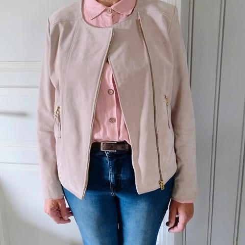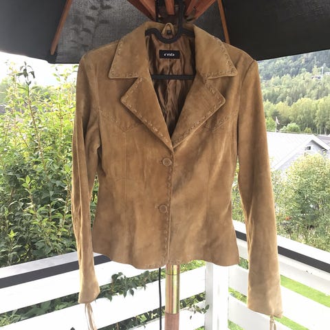 Selger min pent brukte gråbeige semskede skinnjakke billig. Veldig stilig! Litt liten i størrelsen