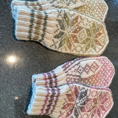 Fine Selbuvotter og Cortinavotter strikket i ull av og selges for dame på 87.