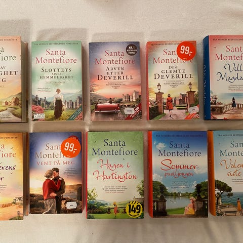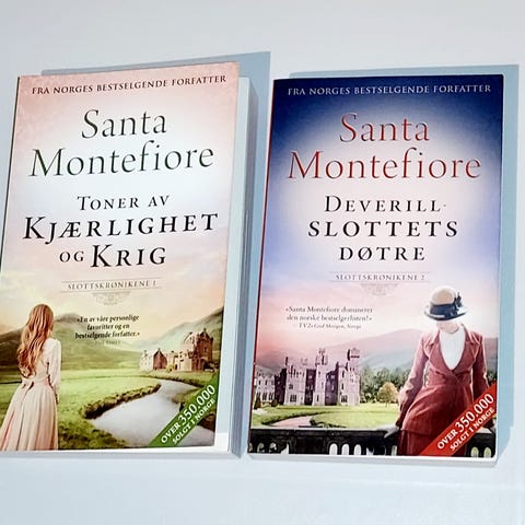 Selger trilogien "Slottskrønikene" av Santa Montefiore. Røykfritt hjem. Pent lest av en person og oppbevart i bokhylle.