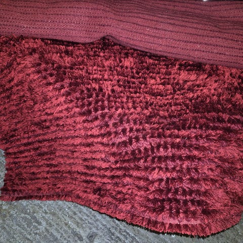 Teppe/pledd i rødt og hvitt. Forskjellig mønster foran og bak. 140 x 160