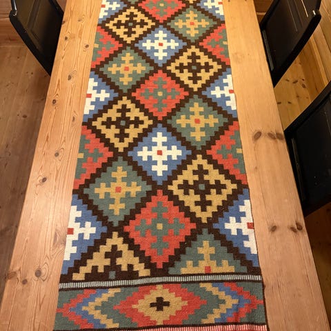Sjarmerende gammel vintage/antikk? håndvevet løper i ull selges. Perfekt til særpreg og vintage preg på hytte eller hjem.