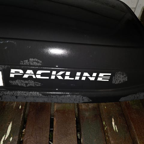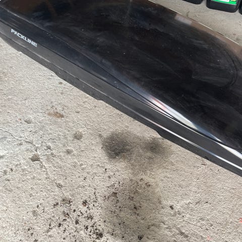 Packline glassfiber skiboks. Boksen er i god stand, merket som "godt brukt" på grunn av den er falmet av vær og vind. Passer mange biler da den enkelt justeres i lengderetning. Mål utvendig: 210cm lang, 85cm bred og 26cm høy (på høyeste punkt). Innvendig, 200cm lang, 74-80cm bred. Justerbar festesone 33cm foran bak. Seksjonene inni boksen er 30+35+40+35+60cm, de to lengdene på 35cm er festesonene til boksen.
