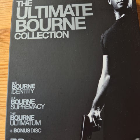 The Ultimate Bourne Collection DVD selges for 50 kr. Inneholder "The Bourne Identity", "The Bourne Supremacy", "The Bourne Ultimatum" og "The Bourne Files bonus disc".