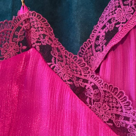 Lekker cerises-farget / rosa topp med gullstropper. Stroppene møtes midt mellom skuldrene bak.