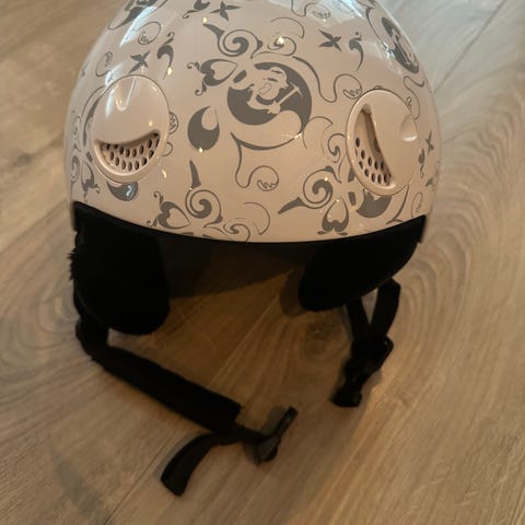 Hjelm til barn/ungdom, str.54. Svart med rød/rosa sommerfugler. Hemper til å feste skibriller og polstret hakestropp. Godt brukt men ingen feil eller skader. Lufteventiler i front. Myk polstring inni. Perfekt til alpint, skøyter ol.