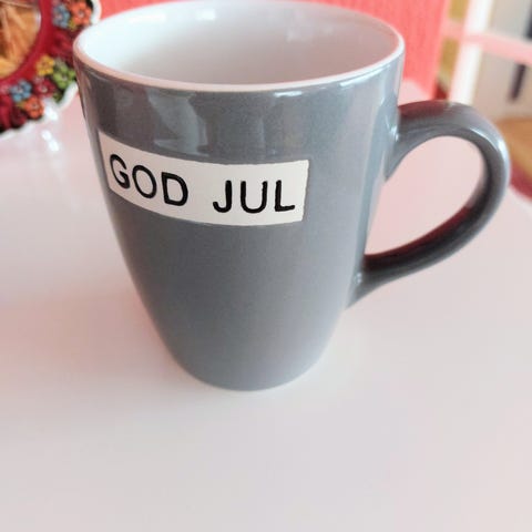 Selger en pent brukt kopp med teksten "Love is all you need" på. D: 8 cm, h: 9 cm.