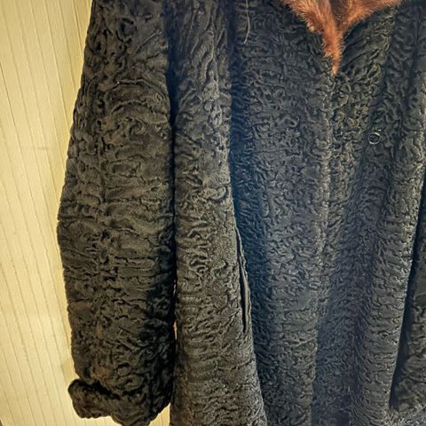 Svart ekte pelskåpe, nydelig myk, krøllete lamm. Selv om den er gammel er den i fin form. Lengen er til under låret. Høy krage.