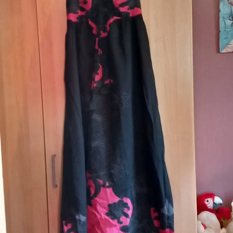 Pen omslagskjole/wrap med hovedfarge svart, mønster i dus rosa, hvitt og grønt. Knapt brukt.