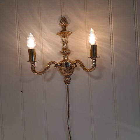 Et par med vel fungerende messing rokokko vegglamper, disse er ikke nye. Selges uten skjermer og pærer. De 2 vegglampene er vel fungerer som de skal. Lampene kommer med hvite ledninger, av/på bryter på ledningen, og ikke jordet stikk eller støpsel. Begge med E14 sokkel til pære, pære er ikke inkludert.