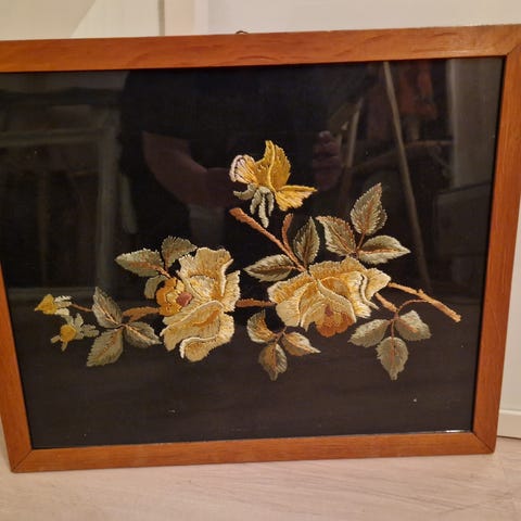 Håndbrodert, vintage bilde i ull av Torghatten med nydelige midnattsolfarger.