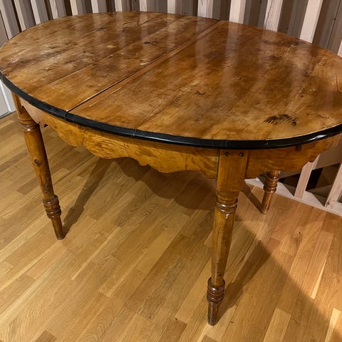 Gammelt bord med illeggsplater. Som synlig på bildet er det er knekk på midten, må repareres.