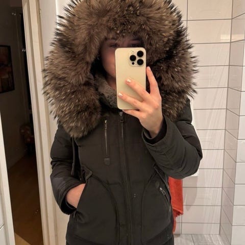 Den er noen år gammel, men brukt til pent og ikke vært en hverdagsjakke som er brukt hver dag. Det siste året har den bare hengt i skapet. Selges som den er, den er ikke nyvasket. Pelsen og hetten kan tas av så man kan vaske jakken i vaskemaskinen og tørketromle den fluffy igjen etterpå. Vil si den fortsatt er i god stand.