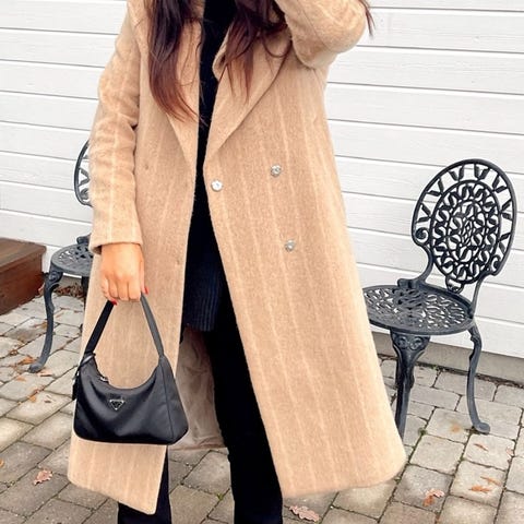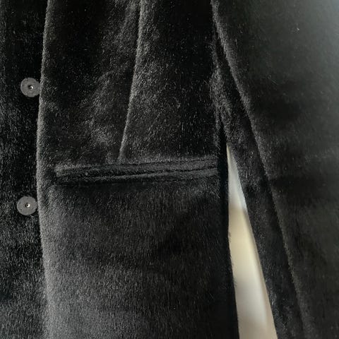 Jeg er 168 høy og den rekker meg til rett over knærne. Selges kr 1000,-