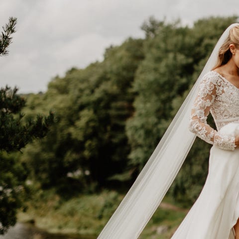 Brudeslør med små hvite perler. Sløret har en blank kam.
