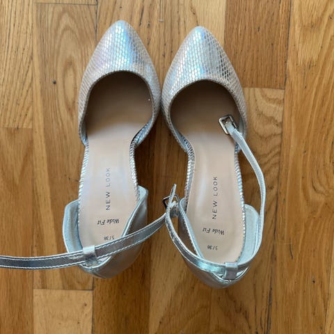 Selger disse nydelige høyhælte skoene i metallisk sølv. Størrelse 37 med en hælhøyde på 6cm. Kun brukt en gang, før de dessverre ble for små. Noe av sølvfargen på innsiden av stroppen som er mot ankelen er borte og noen rester av lim hvis man ser nøye etter (se bilder). Vakkert skopar som fortjener å bli brukt igjen!