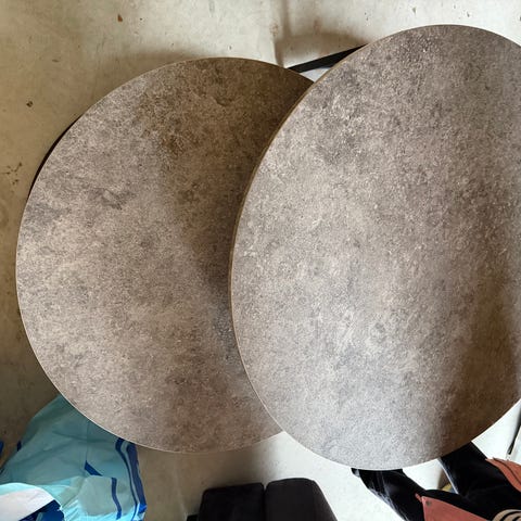 Bordet har et moderne design med en kombinasjon av stein og metallmaterialer.