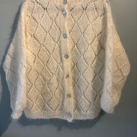 Ny og ubrukt cardigan str L. Strikka med dobbel tråd tynn silk mohair. Lett og lunt plagg. Målt plagget liggjande. Mål rundt under armane 112 cm, heil lengd 59 cm og underarmslengd 46 cm. Kjøpar betalar porto ved sending.